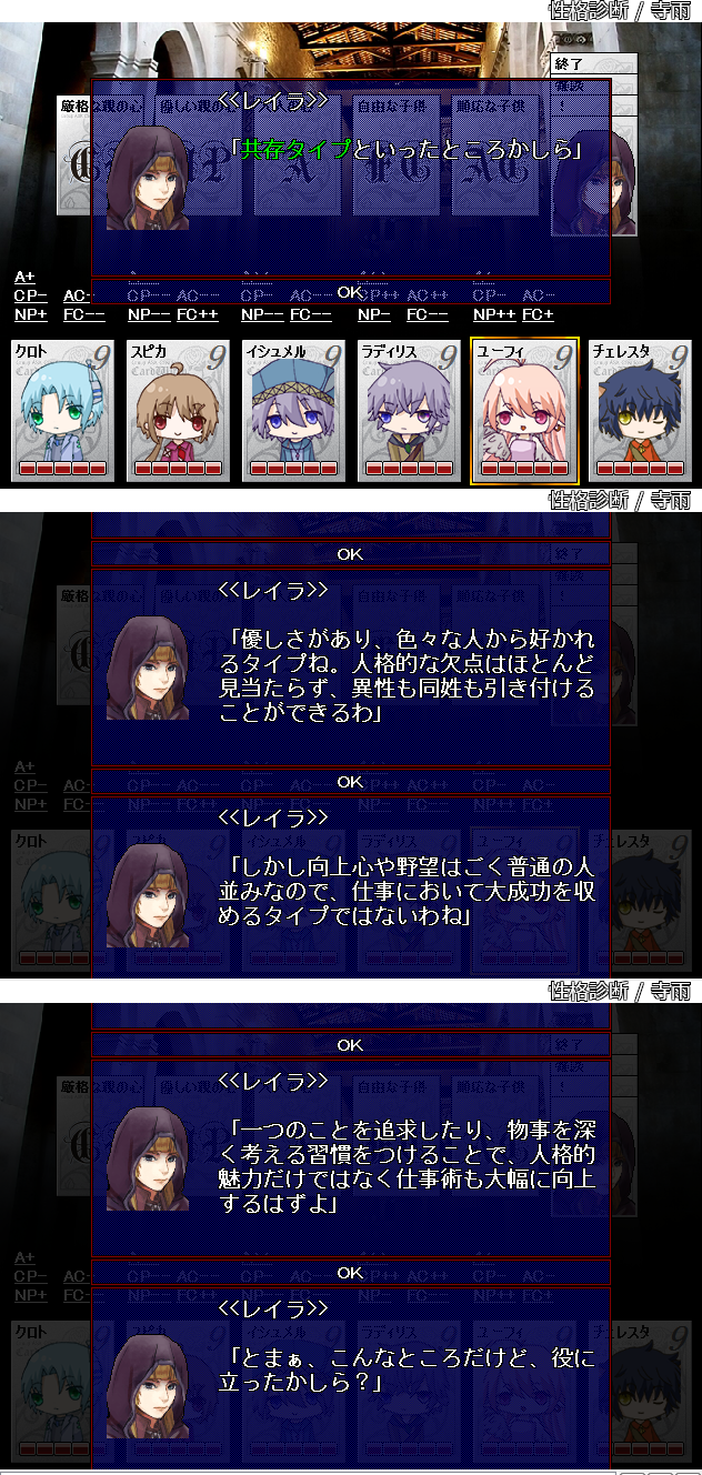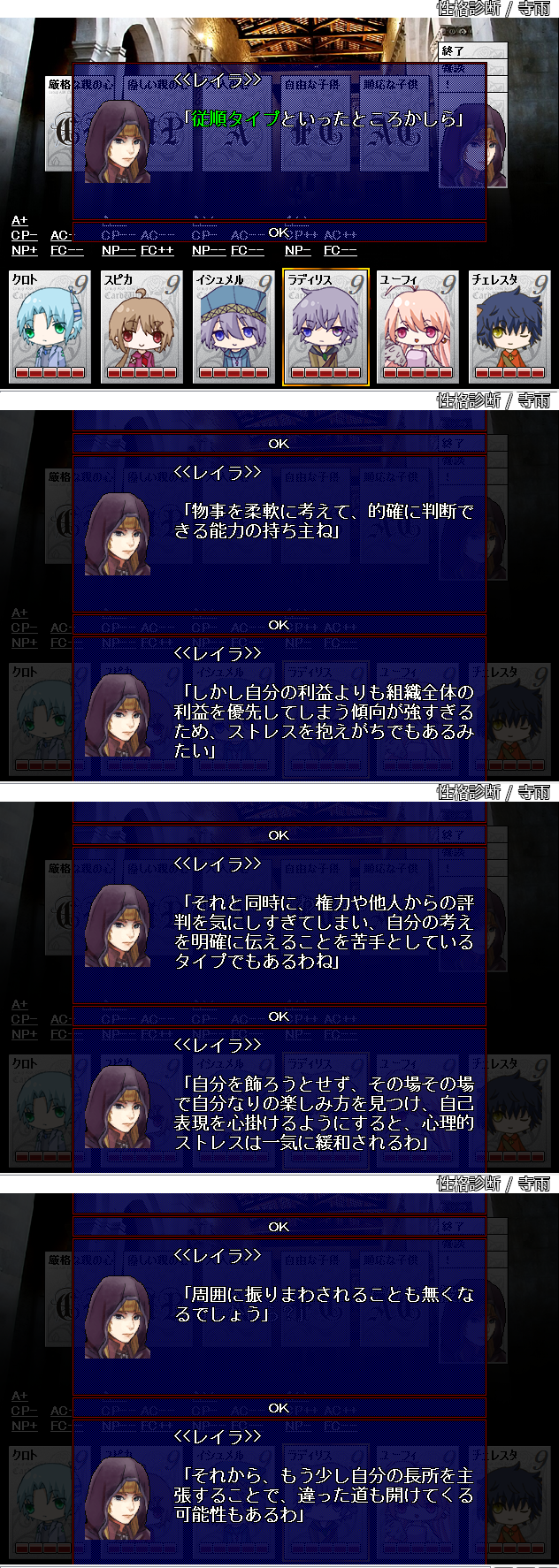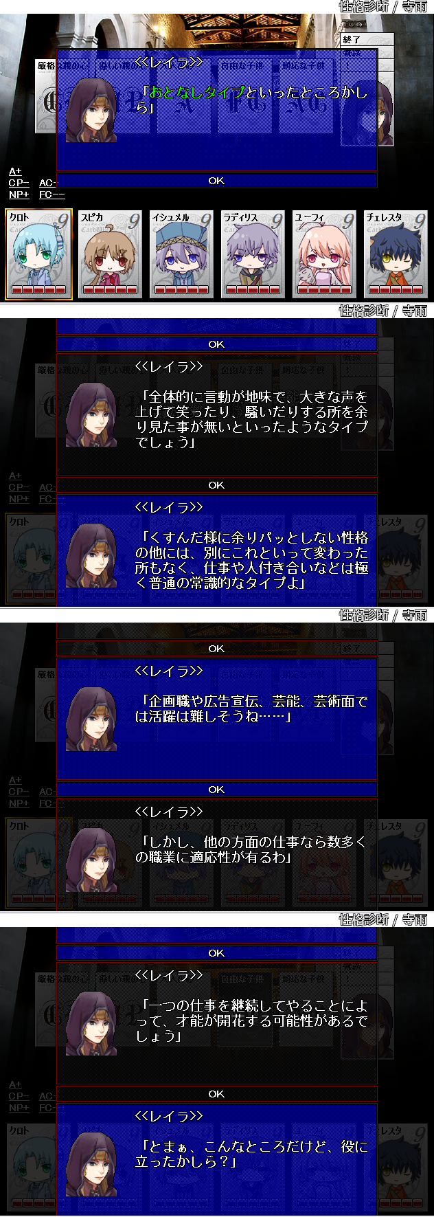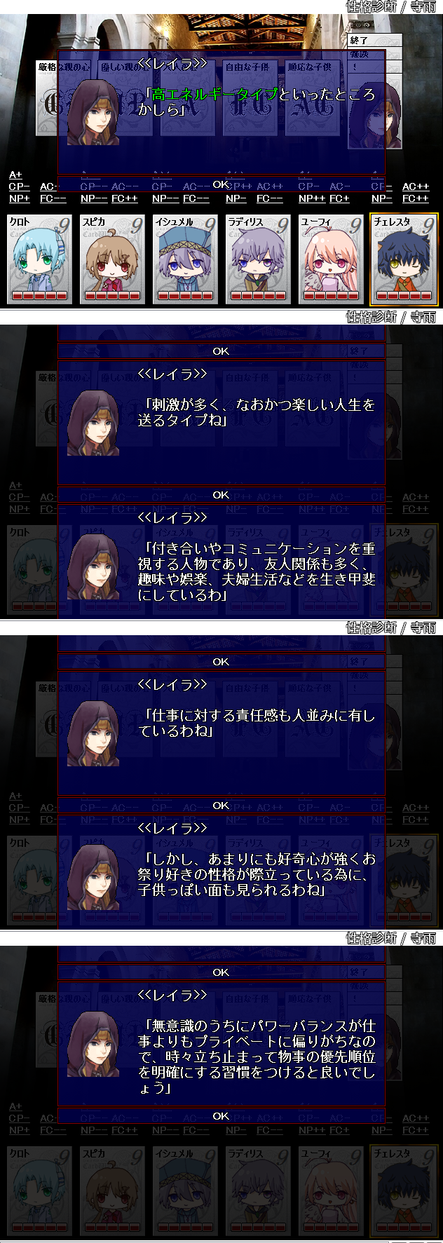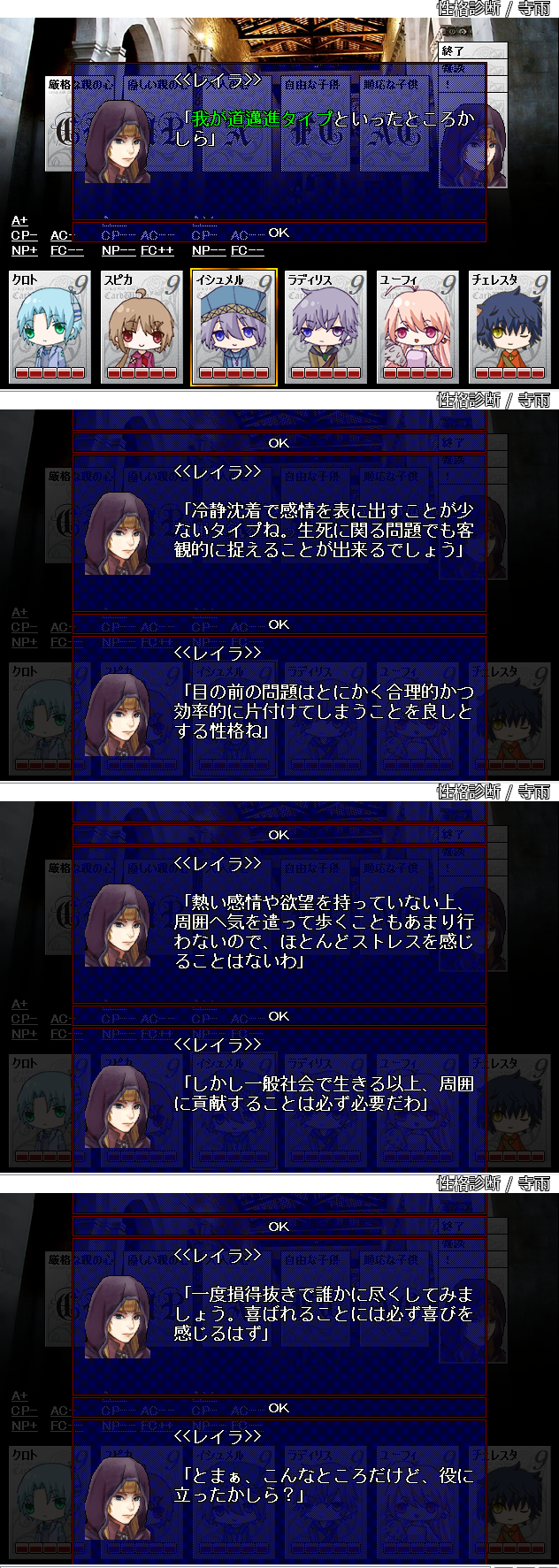 〈秀麗/都会育ち/冷静沈着/利己的/混沌派/進取派/神経質/無頓着/勤勉/高慢〉