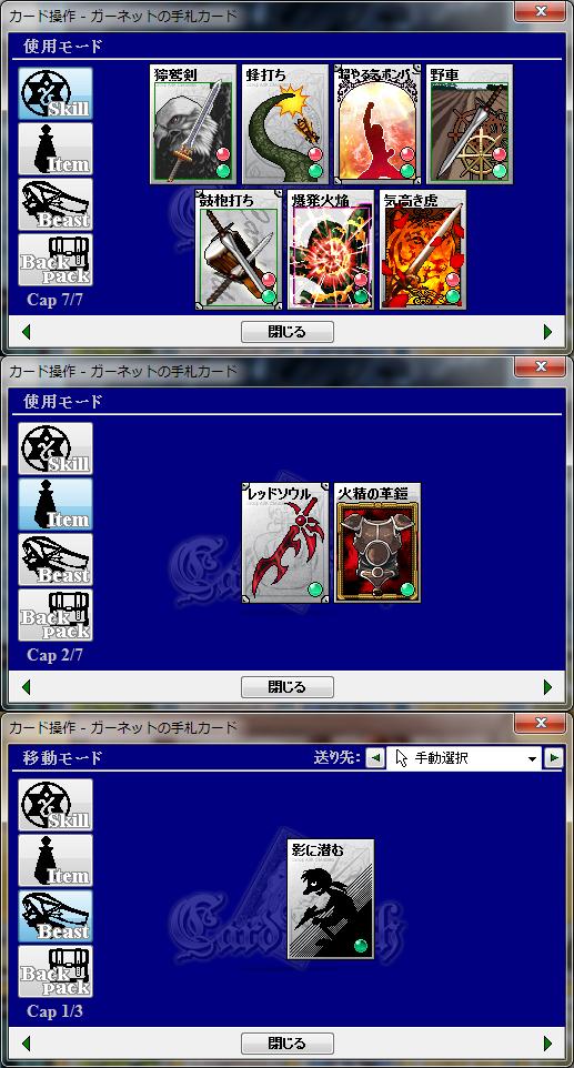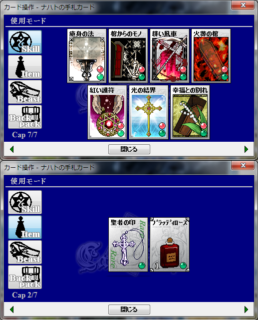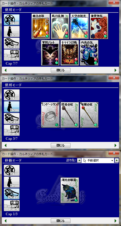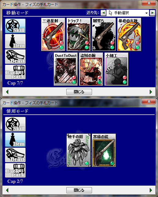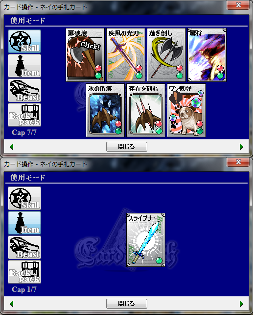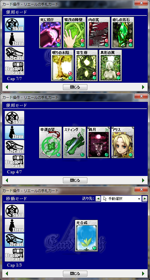 スキル:碧海の都アレトゥーザ(獰鷲剣、小細工)、万魔の街シュカー(蜂打ち)、天体の都アーヴィル(超やる気ボンバー)、焔紡ぎ(野車、鼓枹打ち)、隠れ里ビスティア(爆発火焔)、酒と露天の街デューン(魔法の箒)、笑う怪人(軍隊バット)、賢者の選択(風刃乱舞:画像はリューン衣替えのもの)、黒赤色女帝(兼愛無私)、メリメロ(気高き虎、天空の祝光)、Welcome to Adroad!!(トラップ!、眠りの木陰、癒しの蔦石)、リューン互換+α(癒身の法)、天の光と冥の闇(棺からのモノ、幸福との別れ)、書庫(緋い風車)、鋼鉄の涜神者(火葬の棺)、神と汝の敵を愛せよ(紅い護符)、神威の探求者(光の結界)、狩人はテーブルに集う(扉破壊)、勇者と魔王と聖剣と(疾風の光刃)、知識と技術の店(薙ぎ倒し)、参議指南所NEXTver(鷹狩)、放浪の獣(氷の爪痕、存在を刻む)、ヒャッハー!銃だ!!(暴虐の火種)、城館の街セレネフィア(三連星射、闇撃ち)、月待ち図書館(盗賊の腕)、眠りの森の何とやら(肉の宴)、聖北互換植物スキル(芽吹きの光)、墜落跡地(寄生樹、異形の翼)、神経廻廊(キマイラ召喚)、蝿の国(肉食の泡)、わんわん亭(ワン気弾)、書庫(DustToDust)、悪意と寵愛の人形工房(死に続け)、思い出は緑(繁茂の障壁)