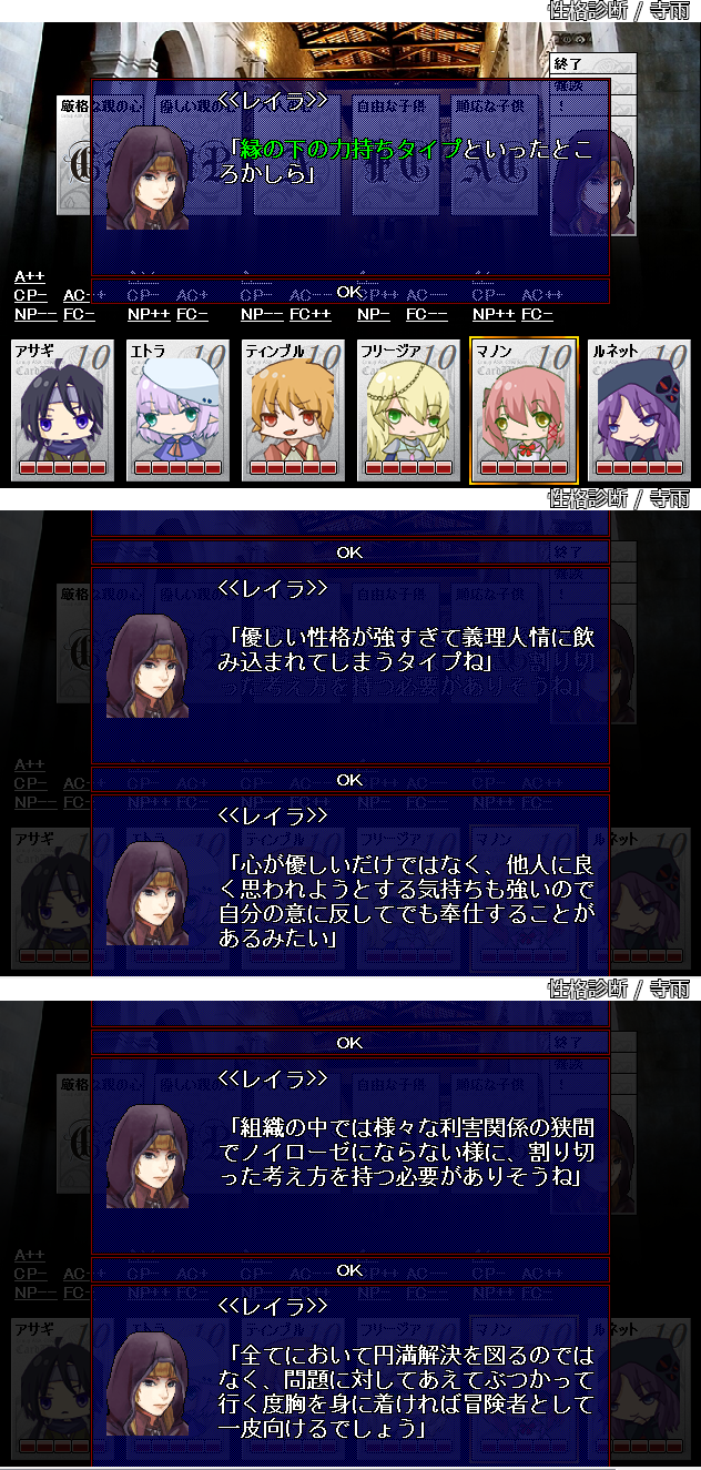 冷血クールに見せかけたヘタレ。メンタル弱い。忍者という以上暗殺者でもあるけど根は悪い奴ではない。最近パーティーのツッコミ役と化してる。扱いはあまりよろしくない。