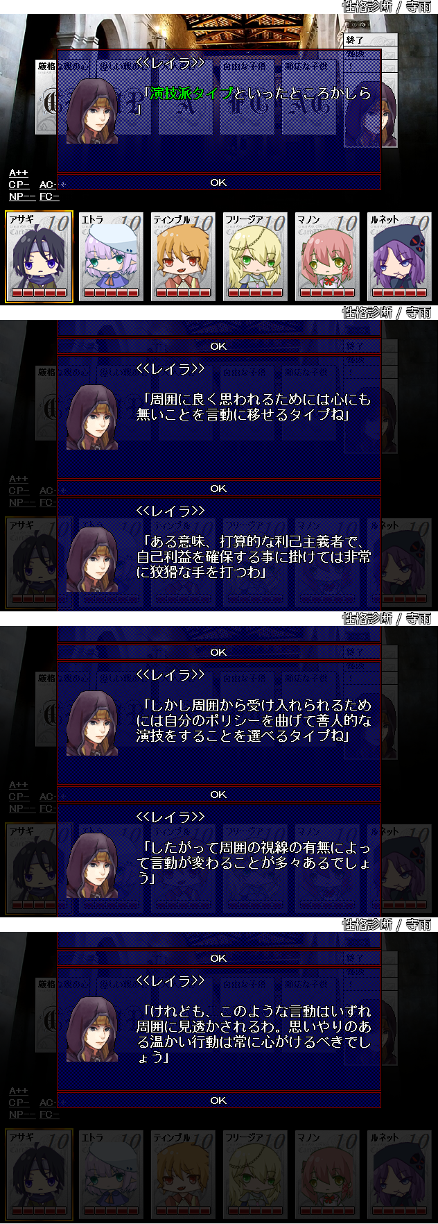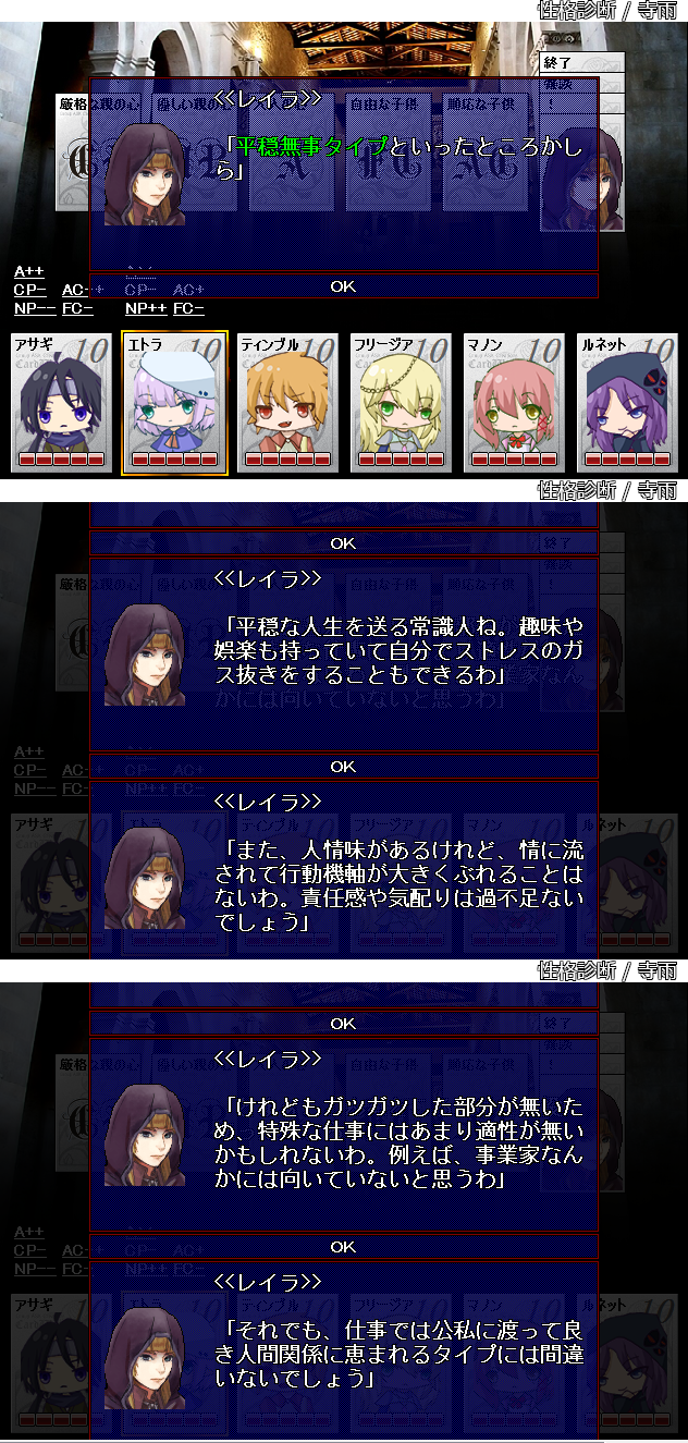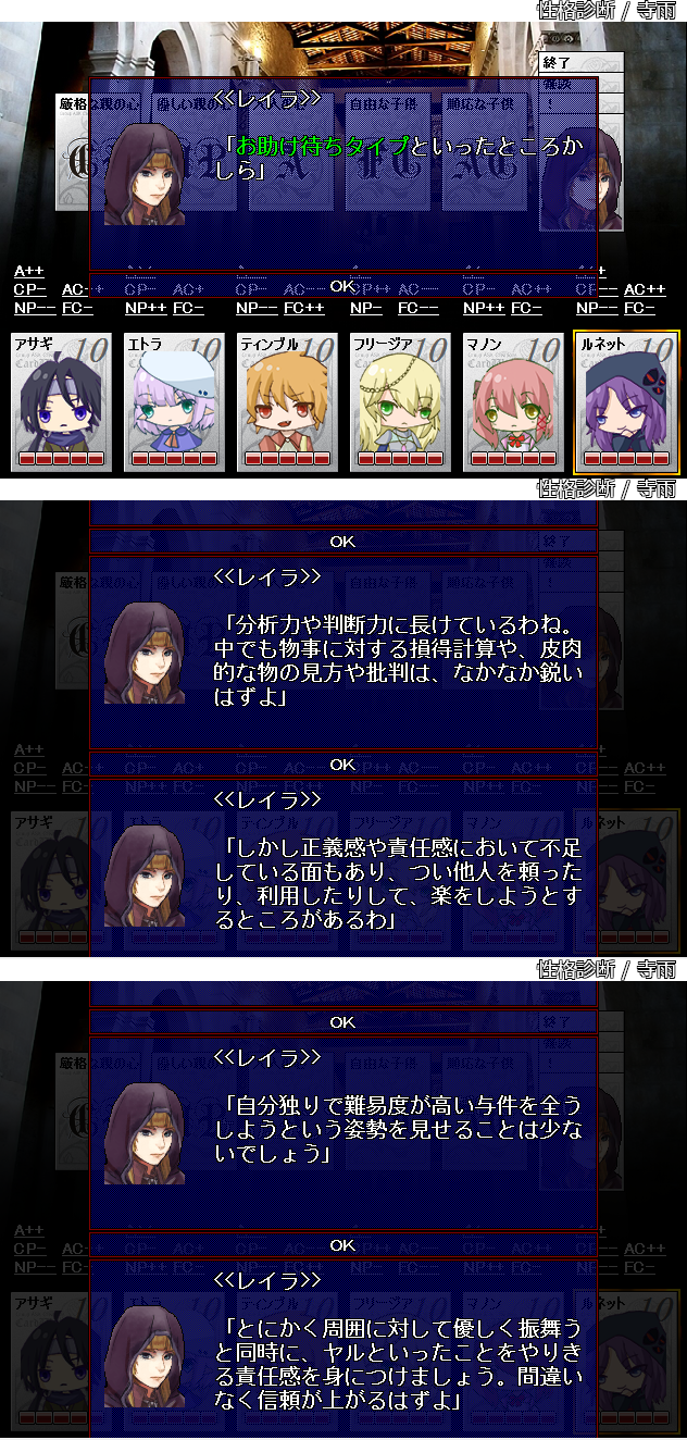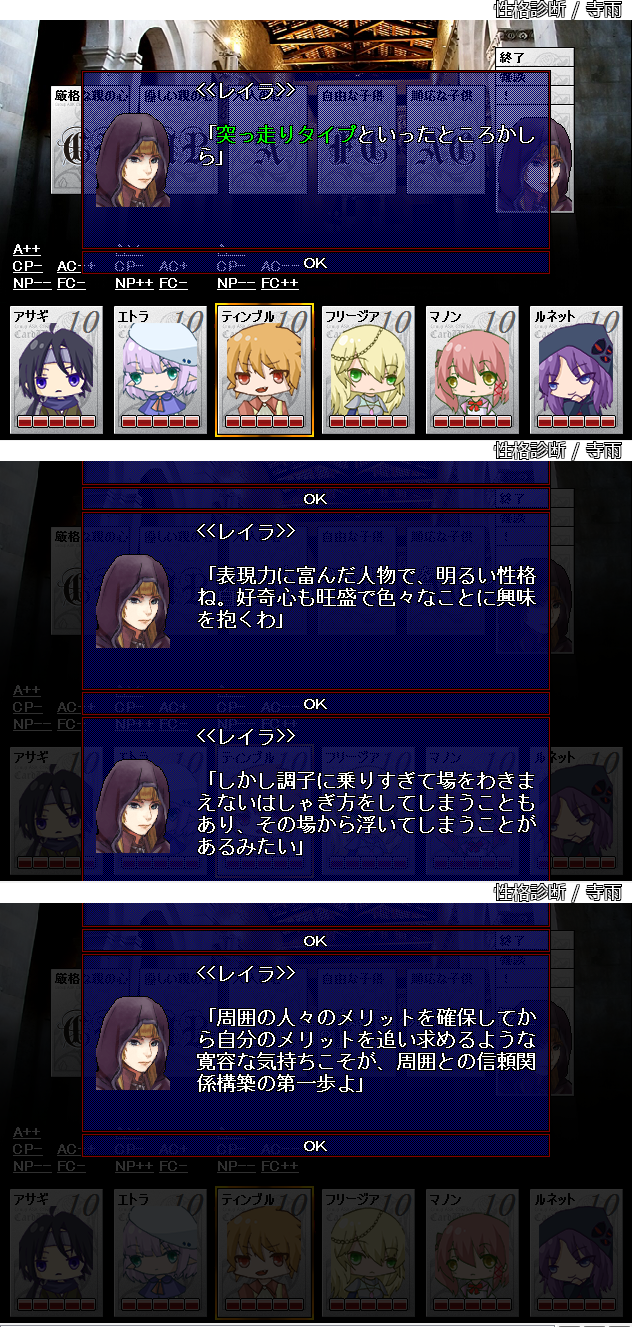 〈秀麗/高貴の出/裕福/秩序派/神経質/過激/高慢/粗野/硬派/ひねくれ者/名誉こそ命〉