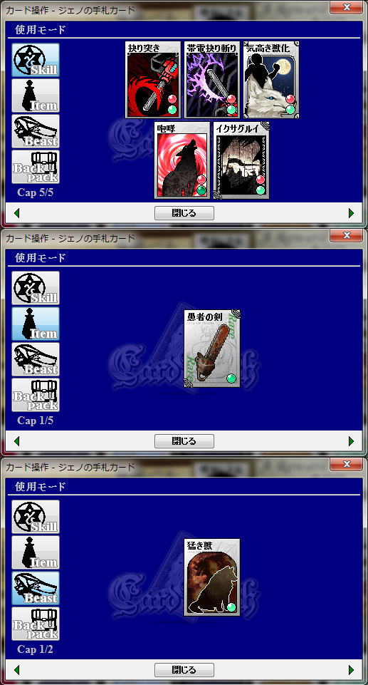 ●出展スキル:時計塔と霧の街(霽月、封鎖)、リューン共同墓地(運命の歯車、黒犬剣)、アークライト傭兵団(月描き)、心奥情景(咲くや仇花、不死の禁呪、勝者斯く語りき、イクサグルイ、極上の蜜、狂犬の忠節)、テンスアニバーサリー(幽霊馬車)、四色の魔法陣(魔法の矢)、万色の魔術師、その遺産(闇夜の障壁)、真夜中の世界(月鏡の儀、咆哮)、碧海の都アレトゥーザ(小細工、絞殺の網)、Granato(緋炎の炸裂)、命削る鋸の音(抉り突き、帯電抉り斬り)、放浪の獣(気高き獣化)、壁際の白骨亭(純情の矢)、城館の街セレネフィア(母なる霊樹)、忘れ水の都(甘き死)、子供狩り(亡霊の哀哭)、リューン互換+α(血玉の秘蹟、相対の金緑石)、フェアリーテイル宝石店(聖泉の祝祷、薙ぐ冬風)アイテム:名前のあった怪物(慈愛の環)、橋の下(護身刀)、赤く沈む洞窟(愚者の剣)、死霊術の館(埋葬目録)、六彩の宝石店(六彩の宝石)